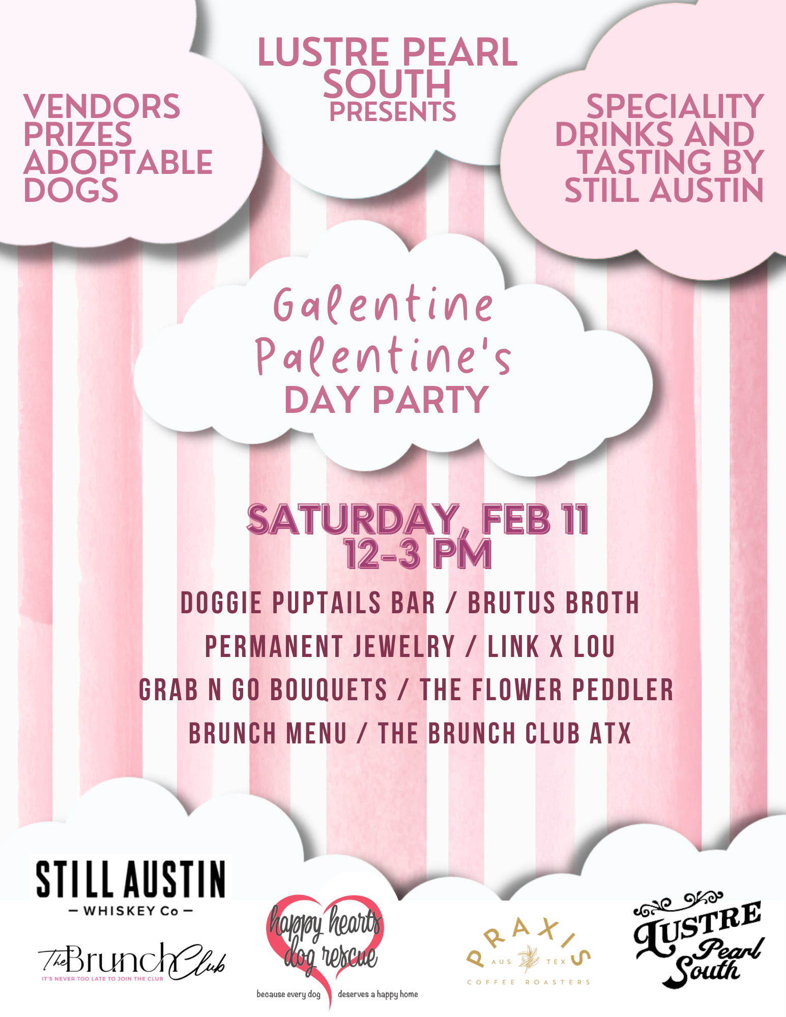 Galentine/Palentine’s Day party will be on Saturday, February 11th from 12-3pm at Lustre Pearl South: 10400 Menchaca Rd, Austin, TX 78748.
